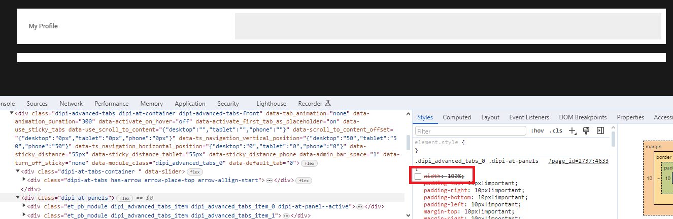 It’s simple, really. When you inspect the CSS for the page using your favorite internet browser’s “Developer’s Tools”, you’ll see the class “.dipi-at-panels” is assigned 100% width. If you disable the width, or set it to “Auto”, the content overflow is no longer there, as it’s perfectly aligned with the tabs above it. For examples, check the screenshots below: