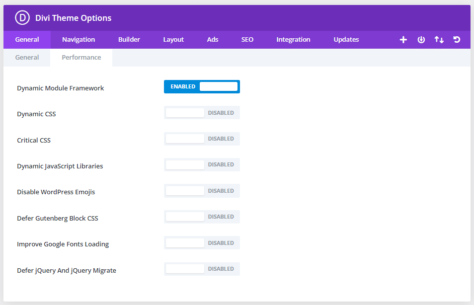 - As a last chance step, you can disable all of Divi’s Performance Optimizations (Except “Dynamic Module Framework”: