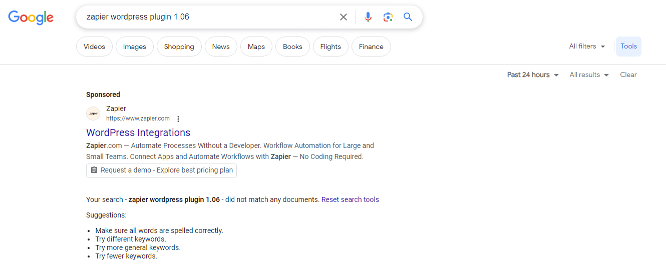 Despite there being a “View version 1.0.6 details” link in the update notification, there is no available changelog on the Zapier Plugin page. Furthermore, searching the web for any additional information about this latest release has returned nothing on Google when filtering for information in the past 24 hours: